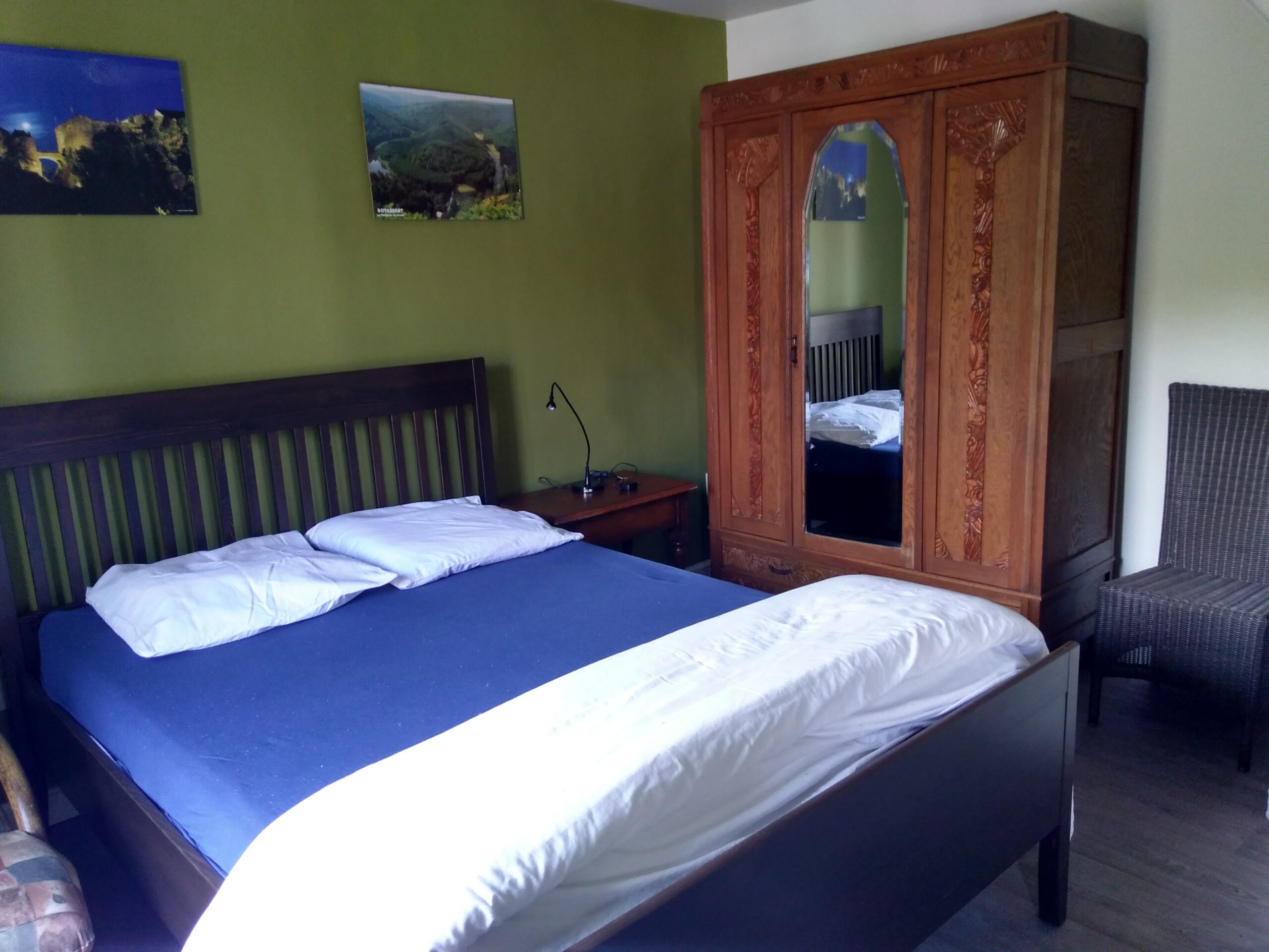 - Een tweepersoons slaapkamer met toilet en lavabo.